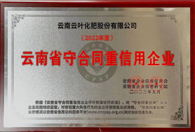 云南省“守合同重信用”企业 2023-09-12 暂无评论 admin 资质荣誉 分享到: 上一篇: 2022年度工会重点工作目标责任评定-特优单位 下一篇: 云叶被评定为“2023云南制造业企业100强” 相关文章 中国中微量元素及肥料产学研创新联盟镁肥专委会 2024全国绿色肥料影响力品牌示范单位——第十五届全国肥料“三新”研讨会牌匾 仓储中心QC小组 “无机一班”为二0二四年云南省化工行业质量信得过班组 “电工组”为二〇二四年云南省化工行业质量信得过班组 云叶被评定为“2023云南高新技术企业100强”第45名 云叶被评定为“2023云南民营企业100强”第63名 云叶被评定为“2023云南制造业企业100强” 2022年度工会重点工作目标责任评定-特优单位 云南省非公企业创新能力10强(2022)第8位